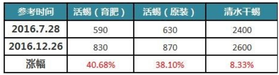 表1:2016年全蝎产新后,各规格行情上涨对比表(单位:公斤/元)。